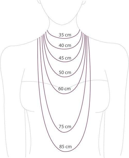 Khi chọn dây chuyền, độ dài là yếu tố quyết định vị trí sợi dây nằm trên cổ và ngực. Thông thường, dây chuyền có các kích thước chuẩn như sau: