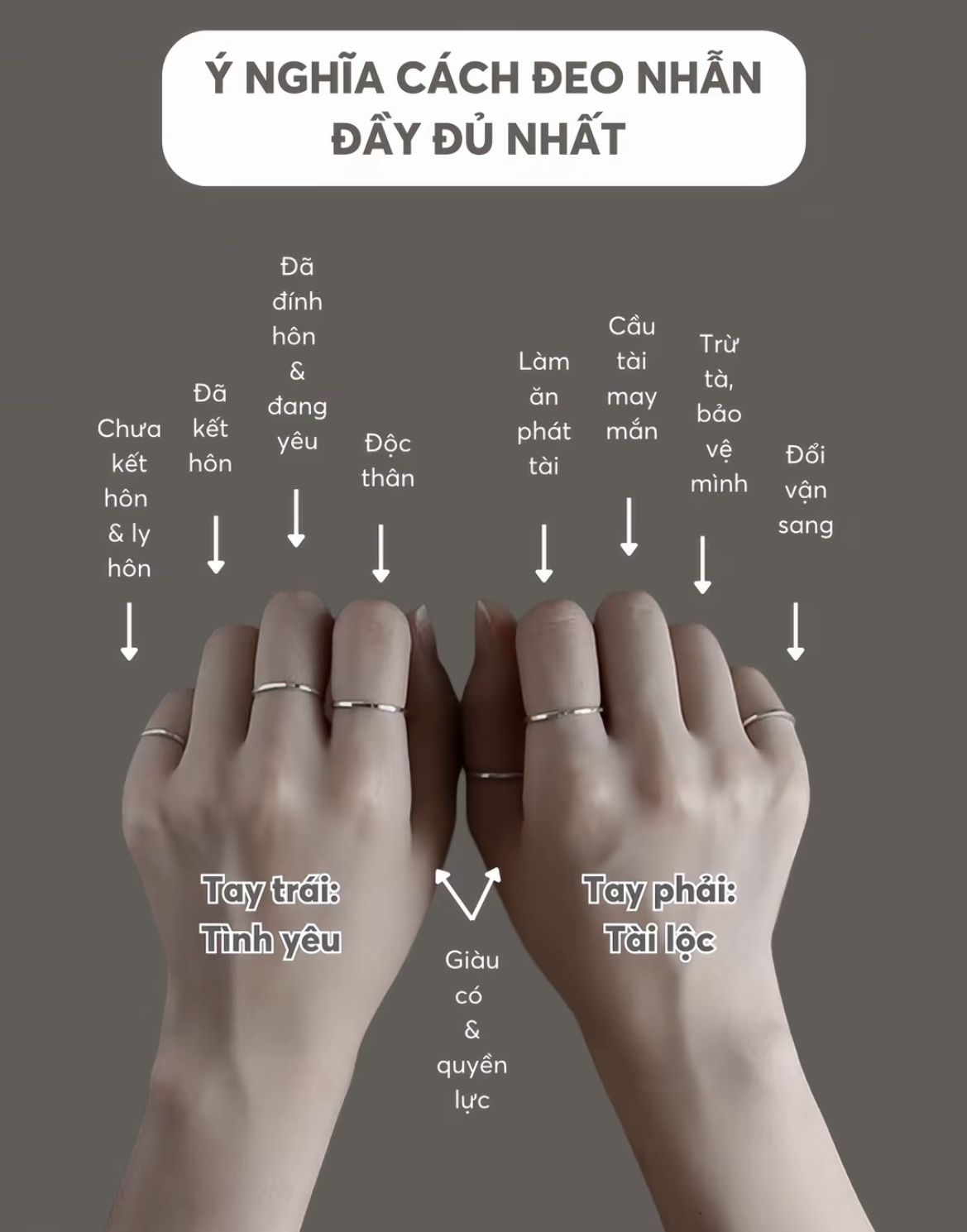 Mỗi ngón tay, mỗi bàn tay đều mang một ý nghĩa riêng khi đeo nhẫn. Việc hiểu rõ sự khác biệt giữa tay trái và tay phải sẽ giúp bạn sử dụng trang sức không chỉ để làm đẹp mà còn để thể hiện bản thân và thu hút những giá trị tích cực trong cuộc sống.
